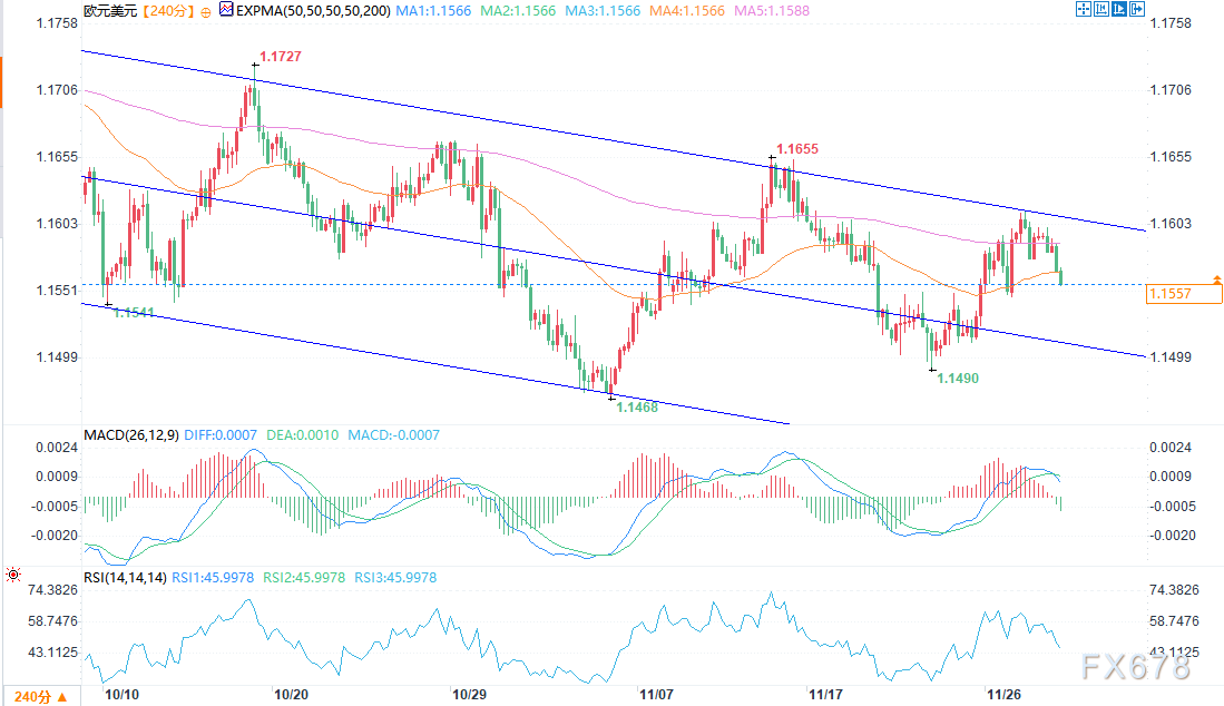 汇通财经APP讯——周五(11月28日)欧盘时段,欧元/美元的分时图处于短期快速下行后的企稳阶段,整体呈现日内空头主导、尾盘微幅修复的节奏。汇价在1.1557附近窄幅震荡,较前一交易日微跌0.32%。