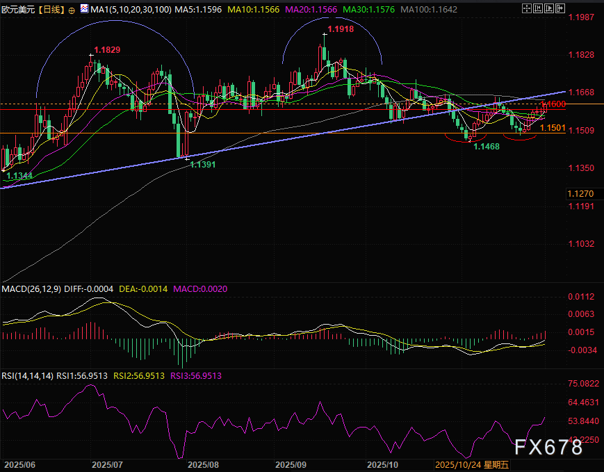 汇价支撑在1.1600和5日线1.1596处。