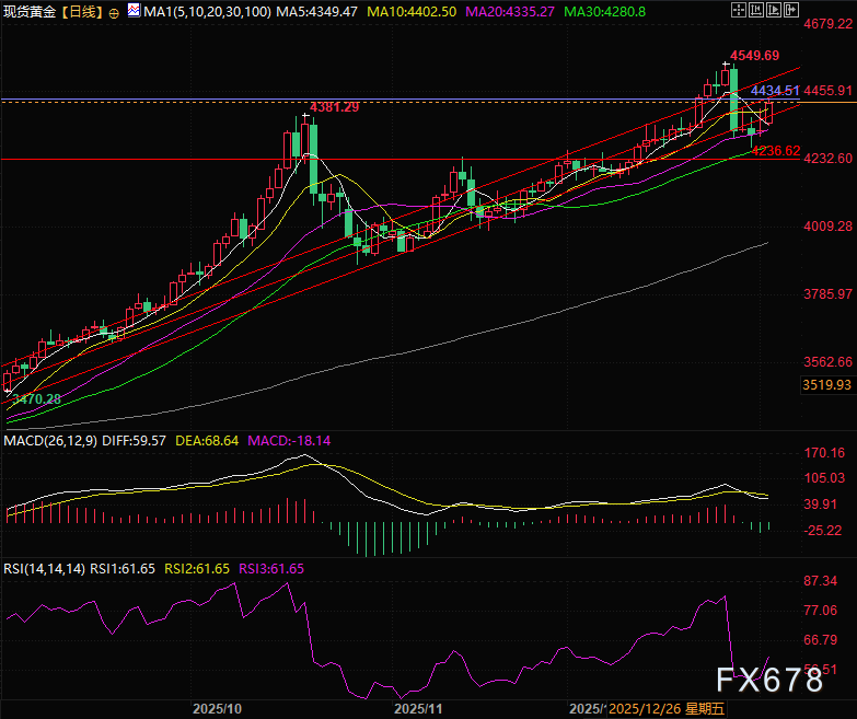 技术面现货黄金的多空风水岭在4434.56,目前黄金最高价至4430,这个点位需要密接关注,同时金价继续沿着上升通道运行,如果之后金价能站稳4430,则有机会继续上涨。